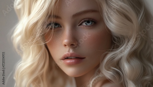 The illustration shows a close-up view of a female face featuring light skin, blonde hair, and blue eyes.