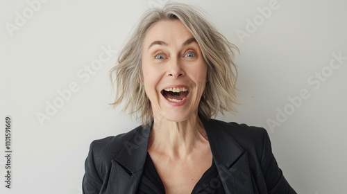 The image depicts a woman with a surprised expression wearing a black blazer over a black shirt set against a white background.