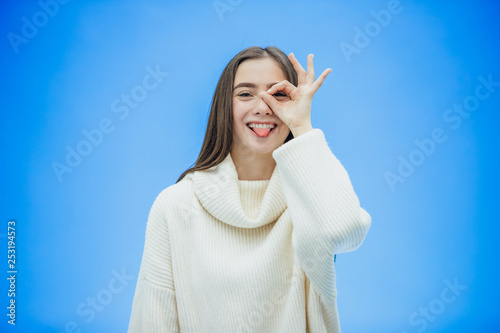 The image of a happy young lady standing on a blue background. Look into the camera. During this time she is dressed in a white warm sweater and shows various gestures.