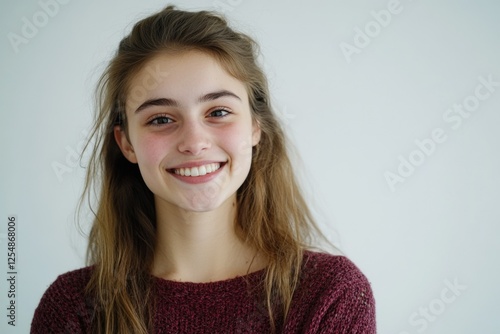 The image shows a cheerful young woman with rosy cheeks, wearing a cozy sweater and smiling at the camera. She appears to be indoors with a neutral background behind her.