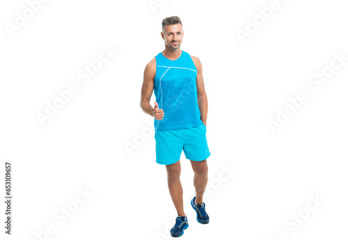 The male sport athlete show thumb up on studio. sport athlete with fit body isolated against white. Sport and healthy lifestyle. full length of athlete. athlete wearing sport wear standing alone
