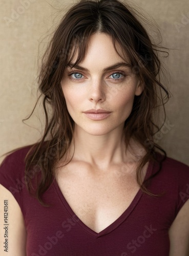 The picture features a woman with red hair and freckles, dressed in a burgundy dress, set against a beige background