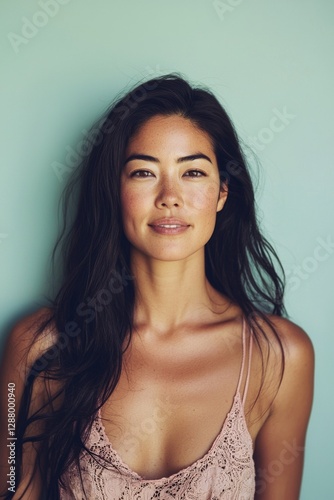 The portrait features a stunning Asian woman with impeccable skin, highlighting her happiness and beauty as a model with a glowing complexion, subtle makeup, and a dazzling white smile against a blue