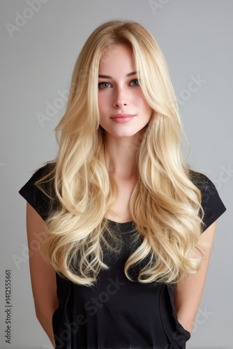 The portrait features a stunning blonde with long, wavy hair and says hello