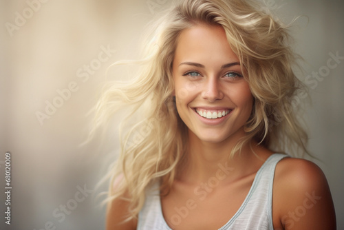 The portrait of a beautiful female model with curly blonde hair and blue eyes in white top smiles to a camera shot indoors. Generative AI.