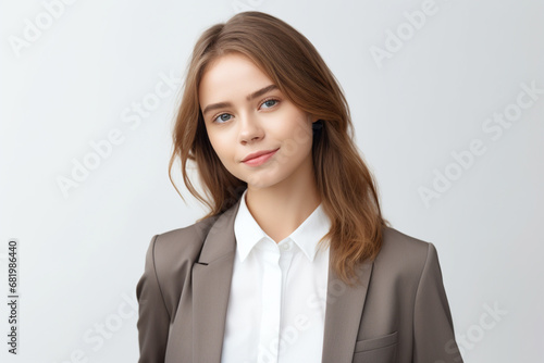 The portrait of a confident business woman in a suit with brown or gray hair standing and posing on a white studio screen background. Generative AI.