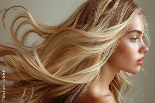 The side view captures the dynamic motion of long, blonde hair creating a lively, swirling effect
