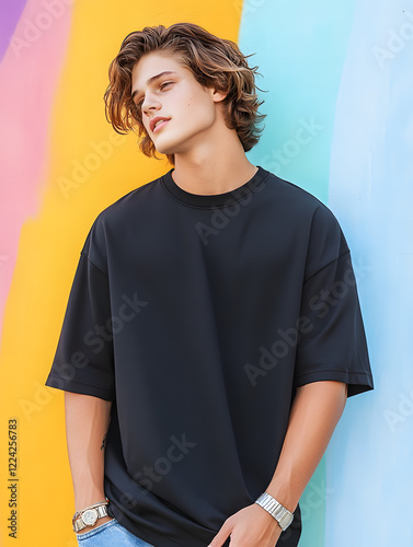 The teenager wear an oversized t-shirt and smiled casually. Take dynamic vertical photos.
