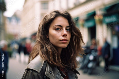 The woman's street style is captured in a portrait photograph, with generative AI technology