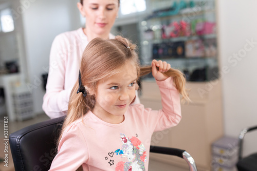 The work of the stylist on hairstyles in a bright salon, the girl makes curls and braids braids of a small beautiful model,