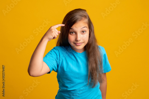 Think use your brain. Smart child. Creative idea. Memory knowledge. Portrait of sarcastic young girl in blue t-shirt pointing finger at temple looking at camera isolated on orange background.
