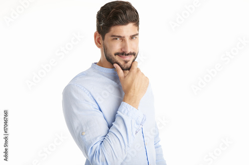 Thinking young man with hand on chin standing against at isolated white background and looking at camera.