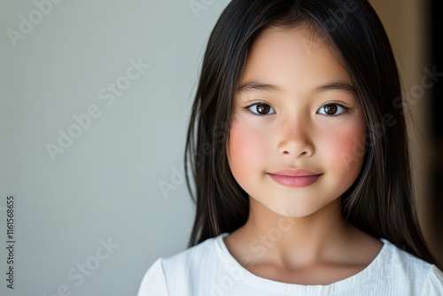 This beautiful portrait captures a young girl with long hair, showcasing her gentle smile and bright eyes, set against a soft and neutral background that highlights her charm.