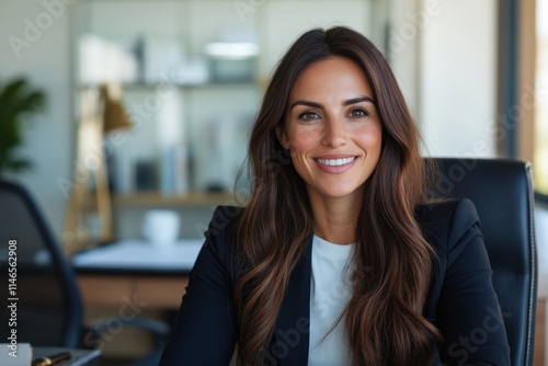 This image captures a joyful businesswoman flashing a bright smile, set against a stylish office backdrop that reflects modern professionalism and success.