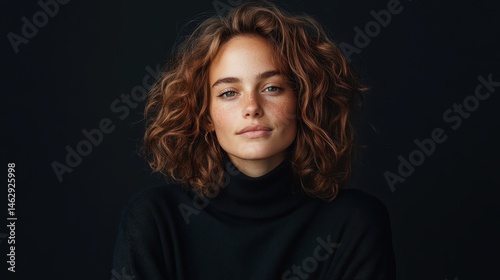 This portrait showcases a young woman with curly hair and a natural smile, reflecting confidence and beauty against a dark backdrop that enhances her features and aura.