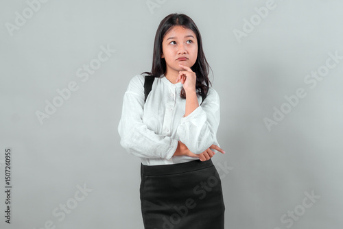 Thoughtful Asian schoolgirl wearing a white shirt and black skirt, standing with a backpack and hand on chin. Concept of education, curiosity, and student decision-making.
