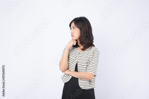 thoughtful asian woman in striped jacket and black dress poses against white background
