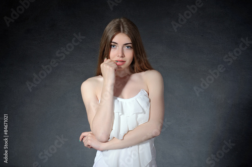 Thoughtful, shy, thinking concept. Woman crossed her arms