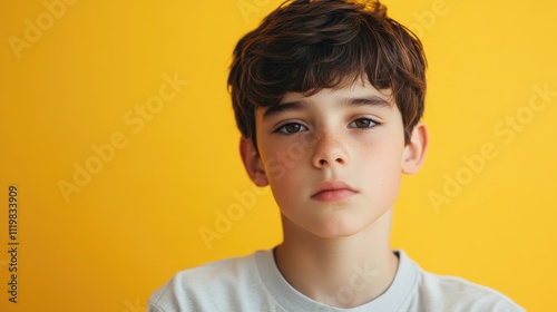 Thoughtful teenage boy with a serious expression against a vibrant yellow background capturing emotion and introspection in a portrait.