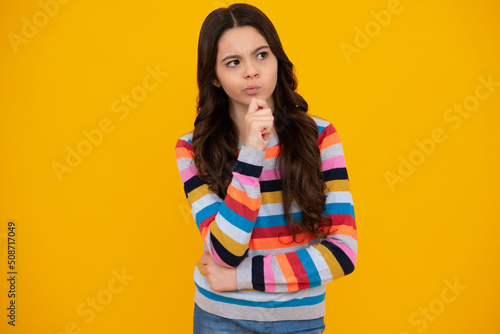 Thoughtful teenager girl touch chin and thinking, pensive child making idea, posing isolated on yellow isolated background. Thinking teenager girl, thoughtful emotion.