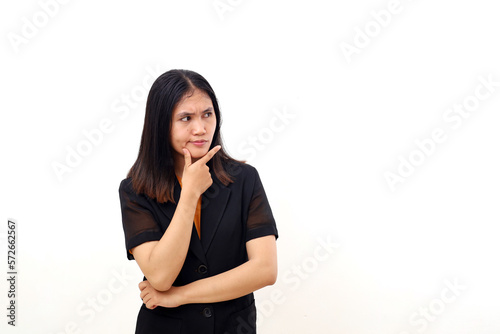 Thoughtful young asian business woman standing while looking beside on blank space. Isolated