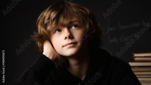 Thoughtful Young Boy Portrait Expresses Curiosity Education Literacy Mental Awareness Relaxed Focus Through Imaginative Studying School Book Reading Expression Black Background Youthful Personality
