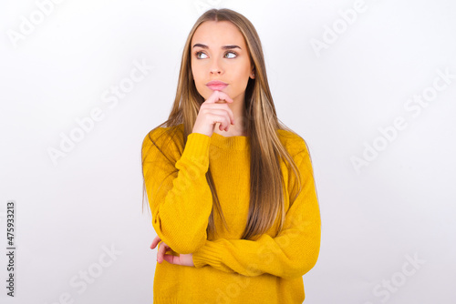 Thoughtful Young caucasian girl wearing yellow sweater over white background holds chin and looks away pensively makes up great plan