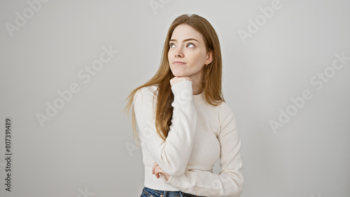 Thoughtful young caucasian woman in casual attire posing against a white background, embodying beauty and youth.