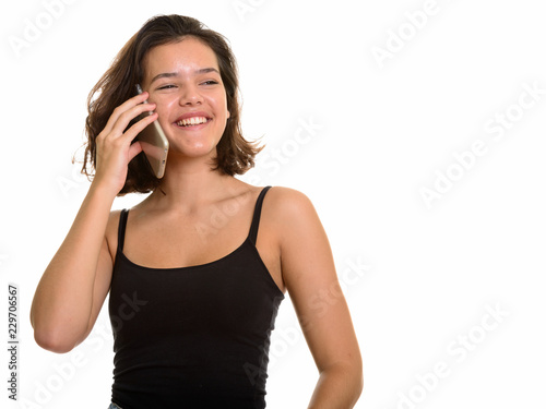 Thoughtful young happy Caucasian teenage girl smiling and talkin