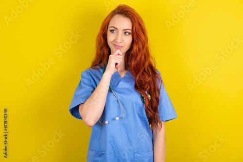 Thoughtful young red-haired doctor woman over yellow studio background holds chin and looks away pensively makes up great plan