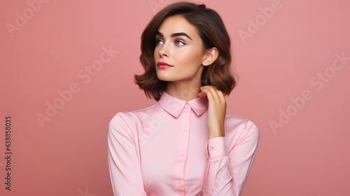 Thoughtful Young Woman in Pink Shirt, Side Glance, Isolated on Pink Background