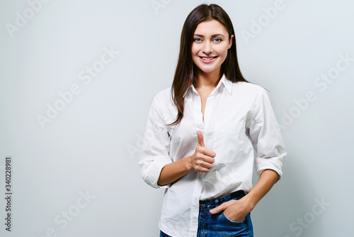 Thumb up! Joy, happiness, satisfaction. Young brunette girl on a white background shows different emotions