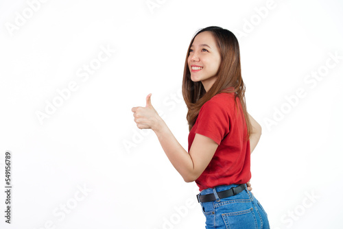 Thumb up, Pretty Asian people wearing red t-shirt for a woman isolated on white background.