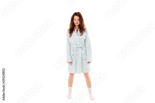 Time for self care. Girl no makeup face long hair wear bathrobe white background. Woman relaxed after massage session. Spa and skin care. Spa and wellness concept. Relax rest and self care. Take care