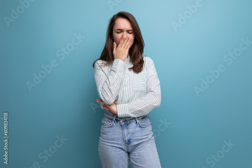 tired 25 year old brown-haired female person dressed in a striped blouse covered her mouth with her hand