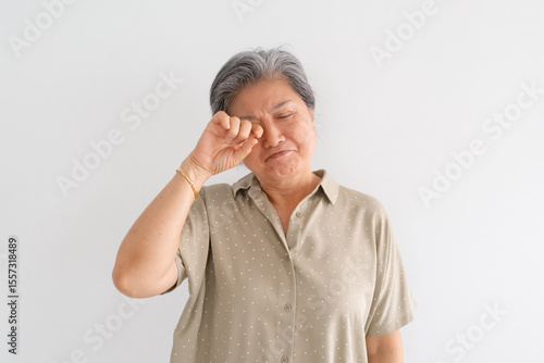 Tired Asian Thai senior woman rubbing one eye with sad face isolated over white background