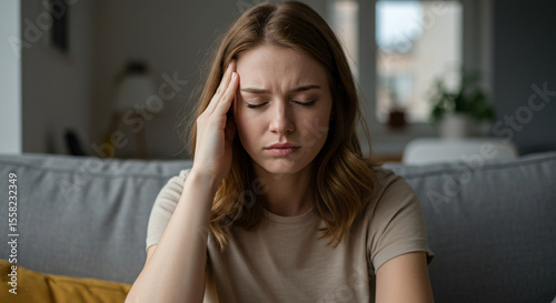 Tired woman having intense headache. Stressed young Caucasian girl suffering from acute migraine or temporal arteritis pain is sitting on the sofa at home and touching her head with her eyes closed