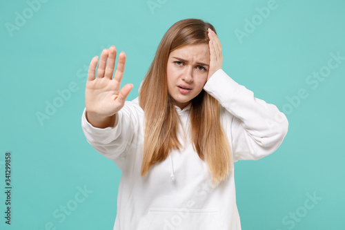 Tired worried young woman girl in casual white hoodie posing isolated on blue turquoise wall background. People lifestyle concept. Mock up copy space. Showing stop gesture with palm, put hand on head.