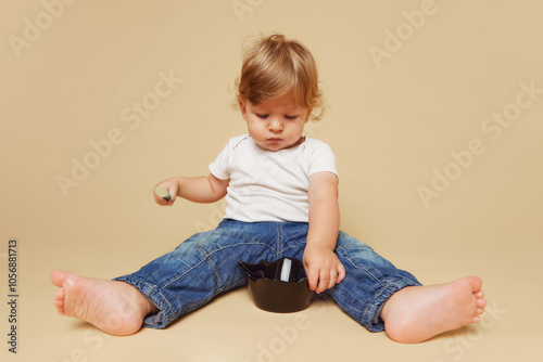 Toddler in casual clothing explores black bowl with spoon, against beige studio background, symbolizing early learning and exploration. Concept of parenthood, natural beauty, love and care