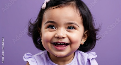 Toddler Latina girl with delicate cheeks and short dark hair giggling soft purple background