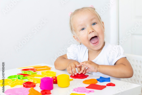 Toddler sculpts from colored plasticine on a white table. The hand of a small child squeezes pieces of colored plasticine. Childrens creativity, educational games, fine motor skills