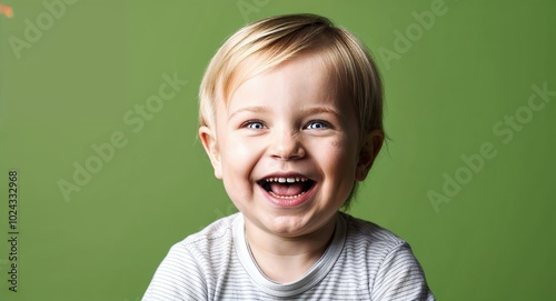 Toddler white boy with bright eyes and straight blonde hair laughing soft green background