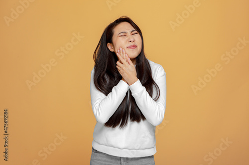 Toothache. Asian young girl touching cheek suffer from sudden tooth pain. Dental clinic, medical insurance advertising