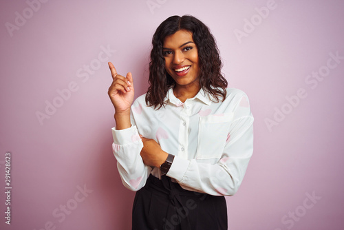 Transsexual transgender businesswoman standing over isolated pink background with a big smile on face, pointing with hand and finger to the side looking at the camera.