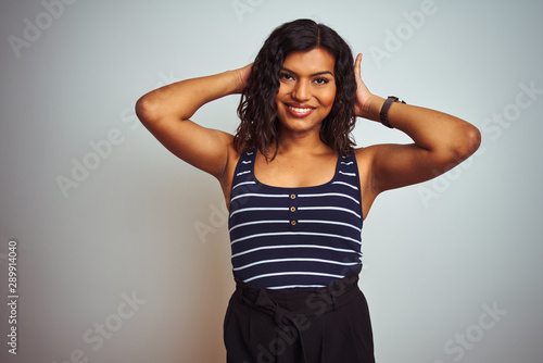 Transsexual transgender woman wearing striped t-shirt over isolated white background relaxing and stretching, arms and hands behind head and neck smiling happy