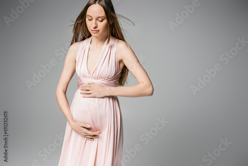 Trendy fair haired pregnant woman posing in pink dress and touching belly while standing isolated on grey with copy space, elegant and stylish pregnancy attire, sensuality, mother-to-be