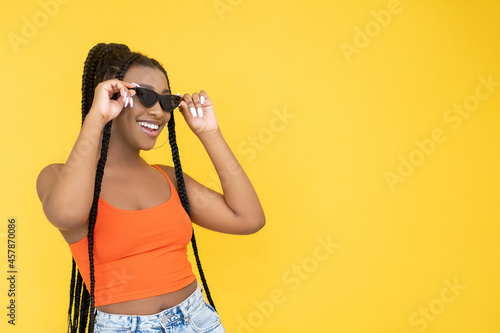 Trendy glasses. Eyewear banner. Optics fashion. African happy smiling woman in stylish sunglasses isolated on yellow empty space background.