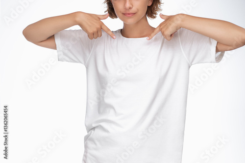 T-shirt design and advertising concept. Style and fashion. Indoor shot of cheerful smiling young caucasian woman with curly hair pointing index finger at copy space on her blank white top. High