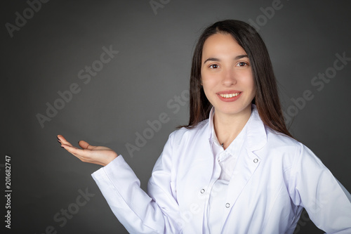 Turkish beautiful smiling young girl in doctor or chef clothes and empty tray pose