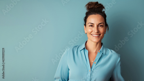 Turkish businesswoman in 40s, brown hair, blue shirt